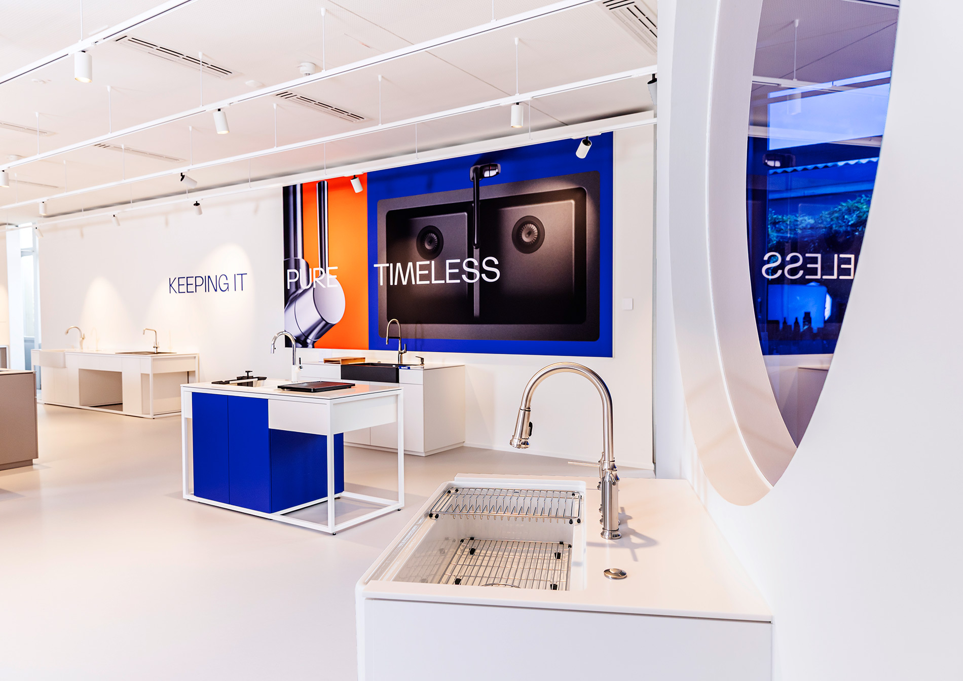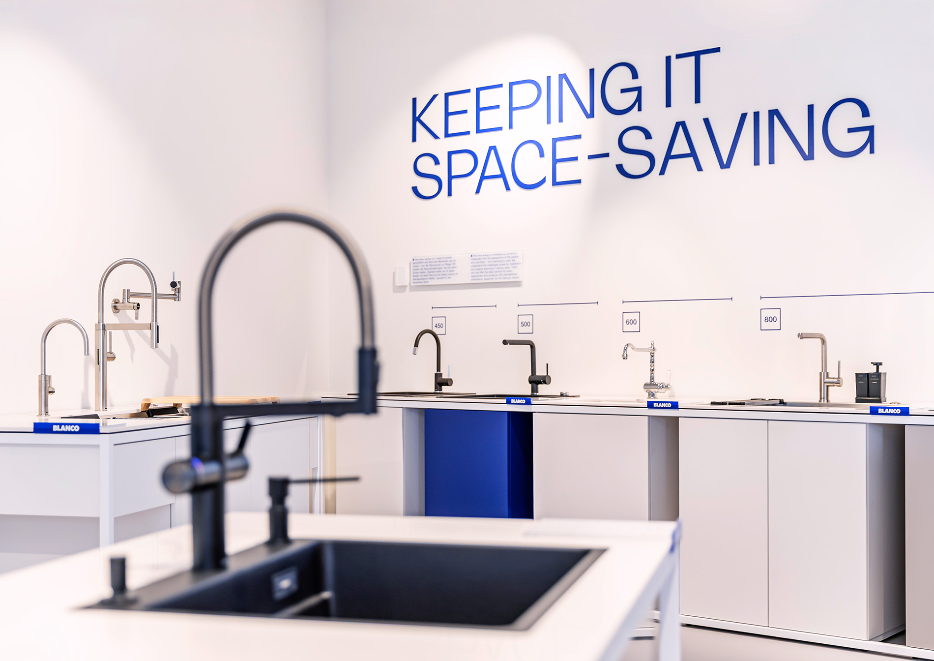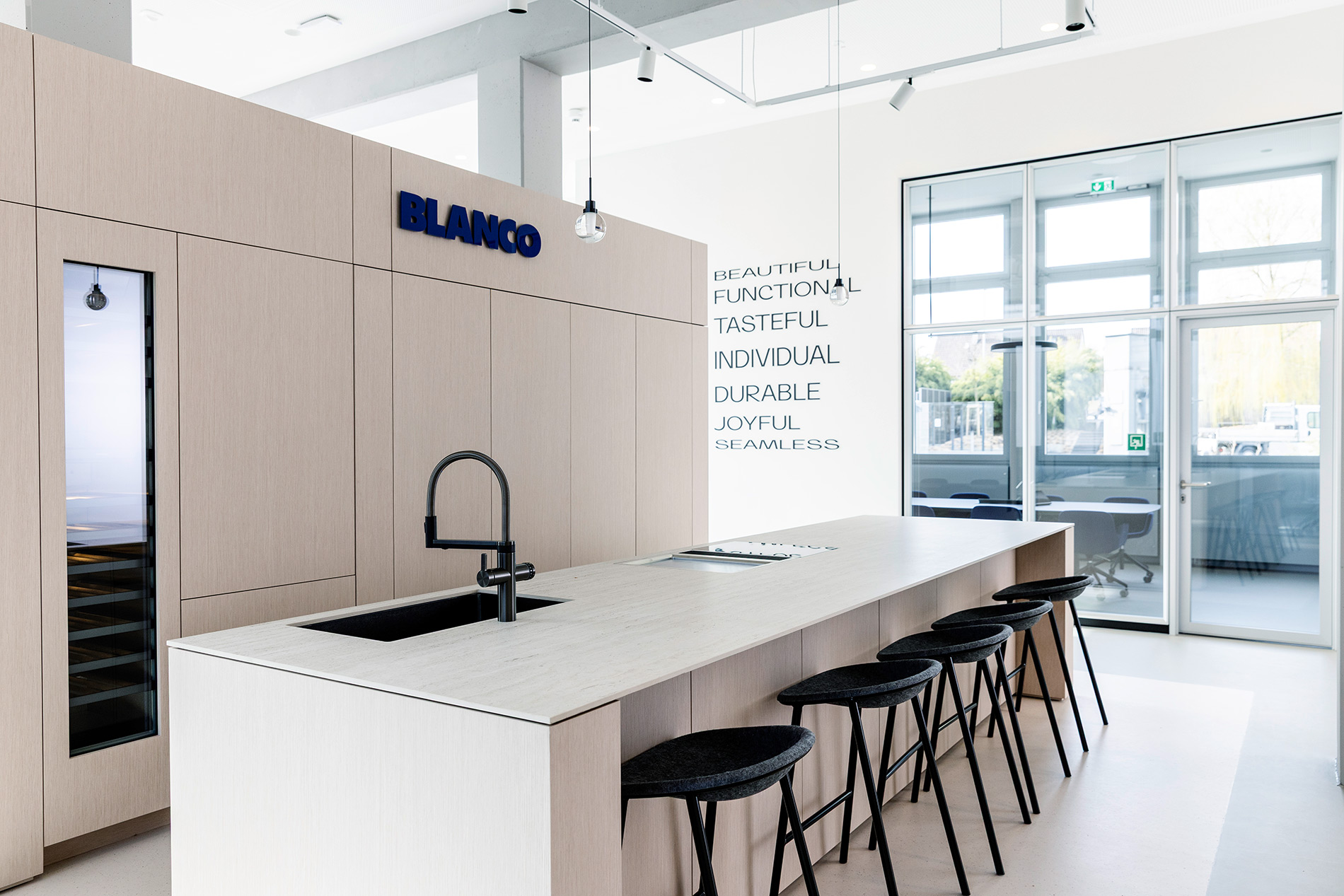 BLANCO beauftragte uns, den Küchenwasserplatz als Herzstück der Premium Küche in klar zonierten Bereichen („Stages“) zu inszenieren. Ziel war es, die BLANCO UNIT in funktionsfähigen Stationen für Beratung, Training und Events erlebbar zu machen.